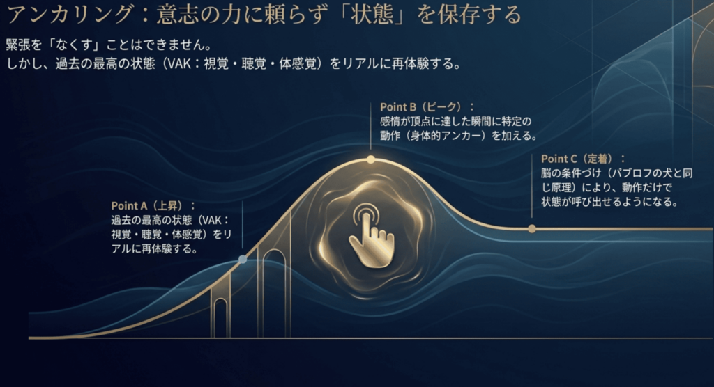 NLPには、アンカリングという技術があります。特定の動作や刺激と、望ましい心理状態を結びつけることで、必要なときにその状態を呼び出せるようにする技術。緊張を「なくす」のではなく、緊張する場面で「別の状態にアクセスする」という発想です。