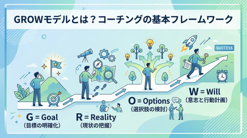 GROWモデルとは、コーチングにおいて対話を通じて相手の目標達成を支援するフレームワークです。